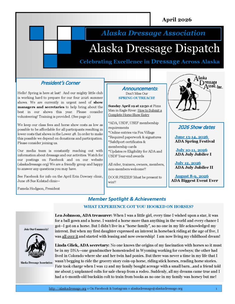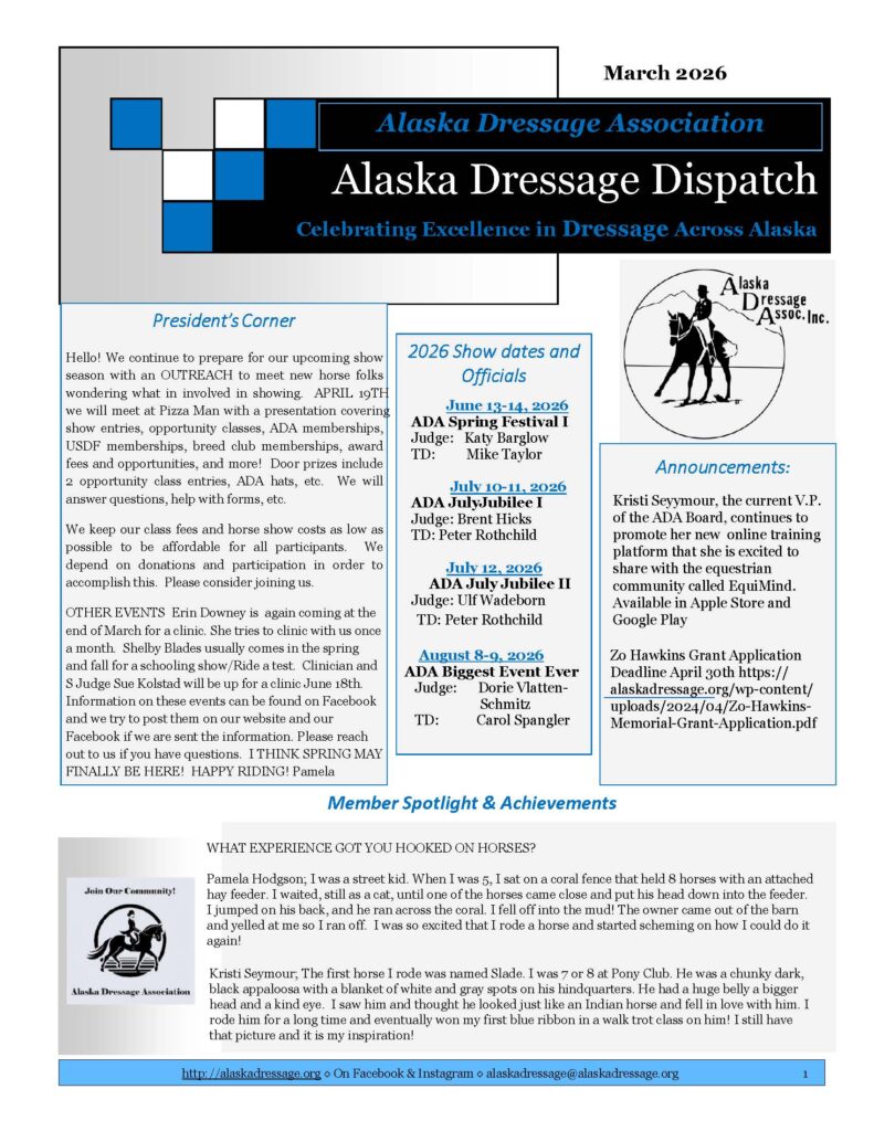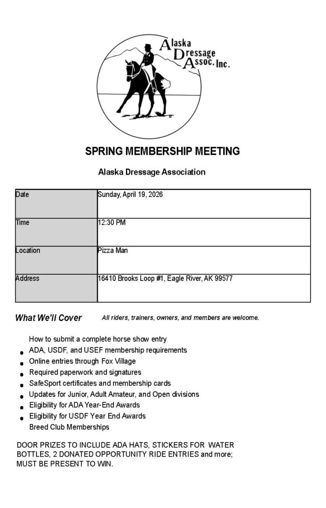 2026 will mark ADA’s 47th year of holding licensed dressage shows in Anchorage each summer, as well as hosting schooling shows, clinics, and related events and providing technical support so that other show managers can include dressage classes in their shows.