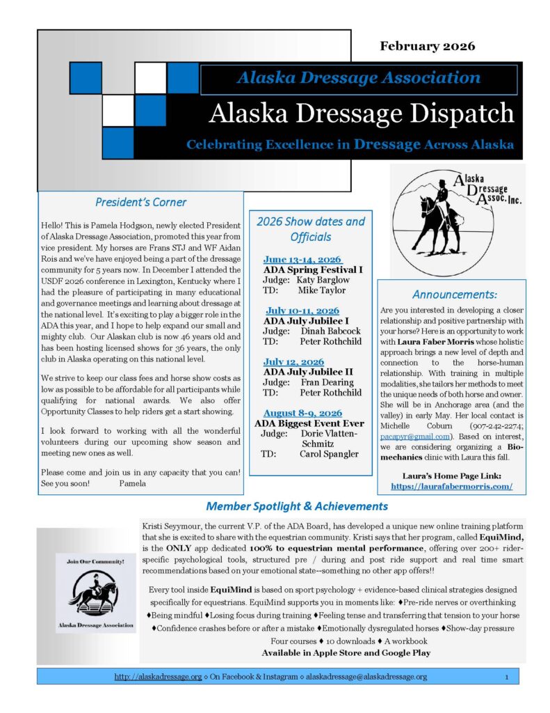 2026 will mark ADA’s 47th year of holding licensed dressage shows in Anchorage each summer, as well as hosting schooling shows, clinics, and related events and providing technical support so that other show managers can include dressage classes in their shows.